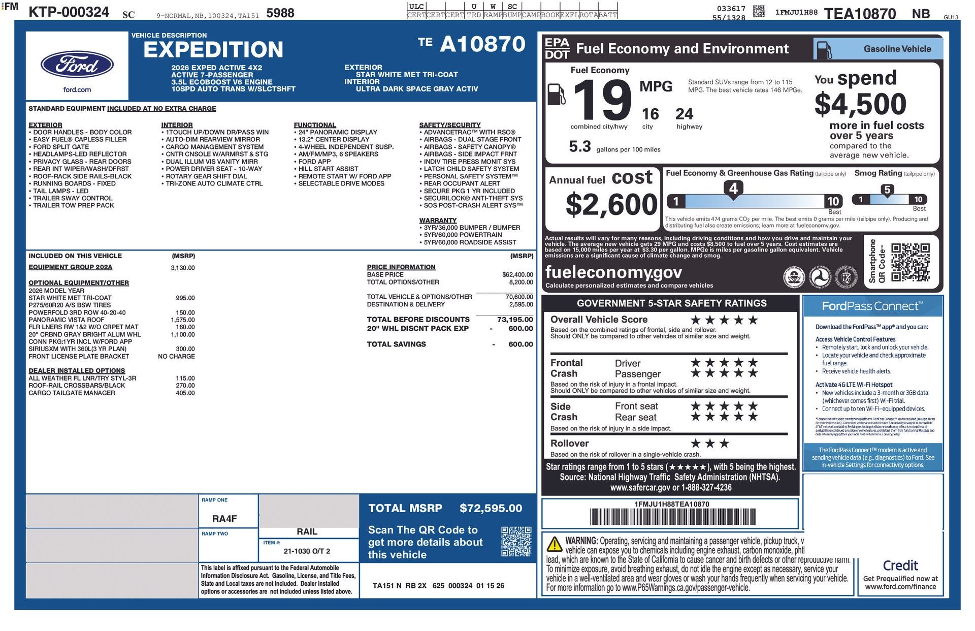 Star White Metallic Tri-Coat 2026 Ford Expedition Active RWD 10-Speed Automatic EcoBoost 3.5L V6 GTDi DOHC 24V Twin Turbocharged Passed Dealer Inspection, Vehicle Detail, Recent Oil Change. Recent Arrival!